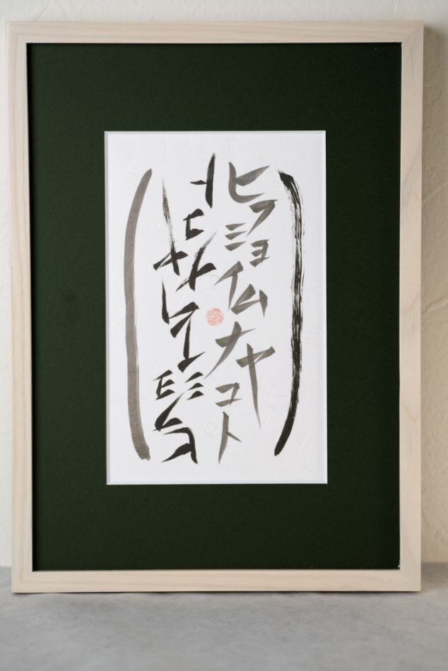 ヒフミ祝詞の「ヒフミヨイムナヤコト」が龍泰文字で書かれています。